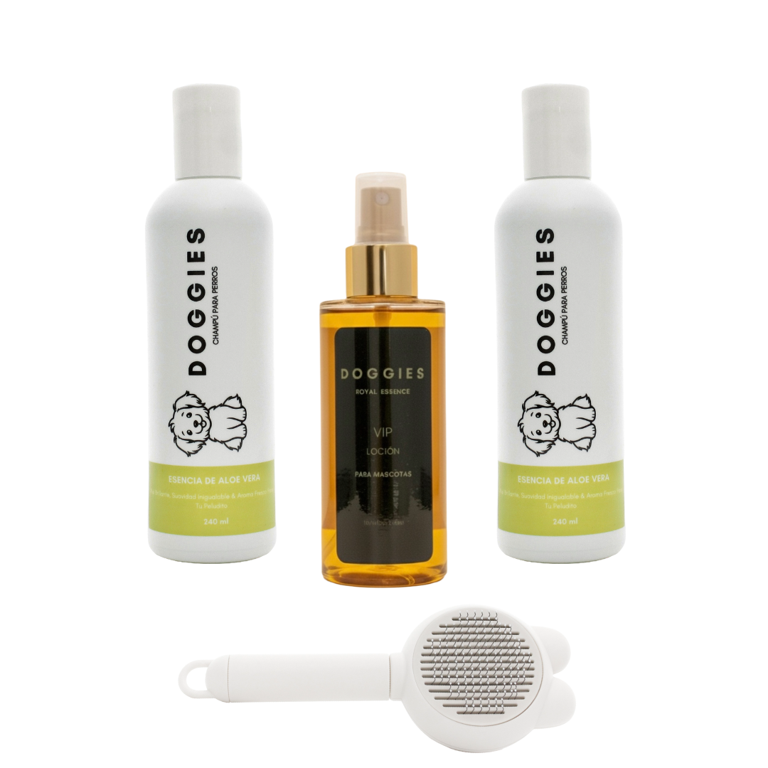 El Kit ideal para el cuidado completo de tu mascota: 2 Shampoos Con Aloe Vera, 1 Perfume VIP Con Notas Cítricas y 1 Cepillo Deslanador Exclusivo. Limpieza, frescura y bienestar en un solo set.